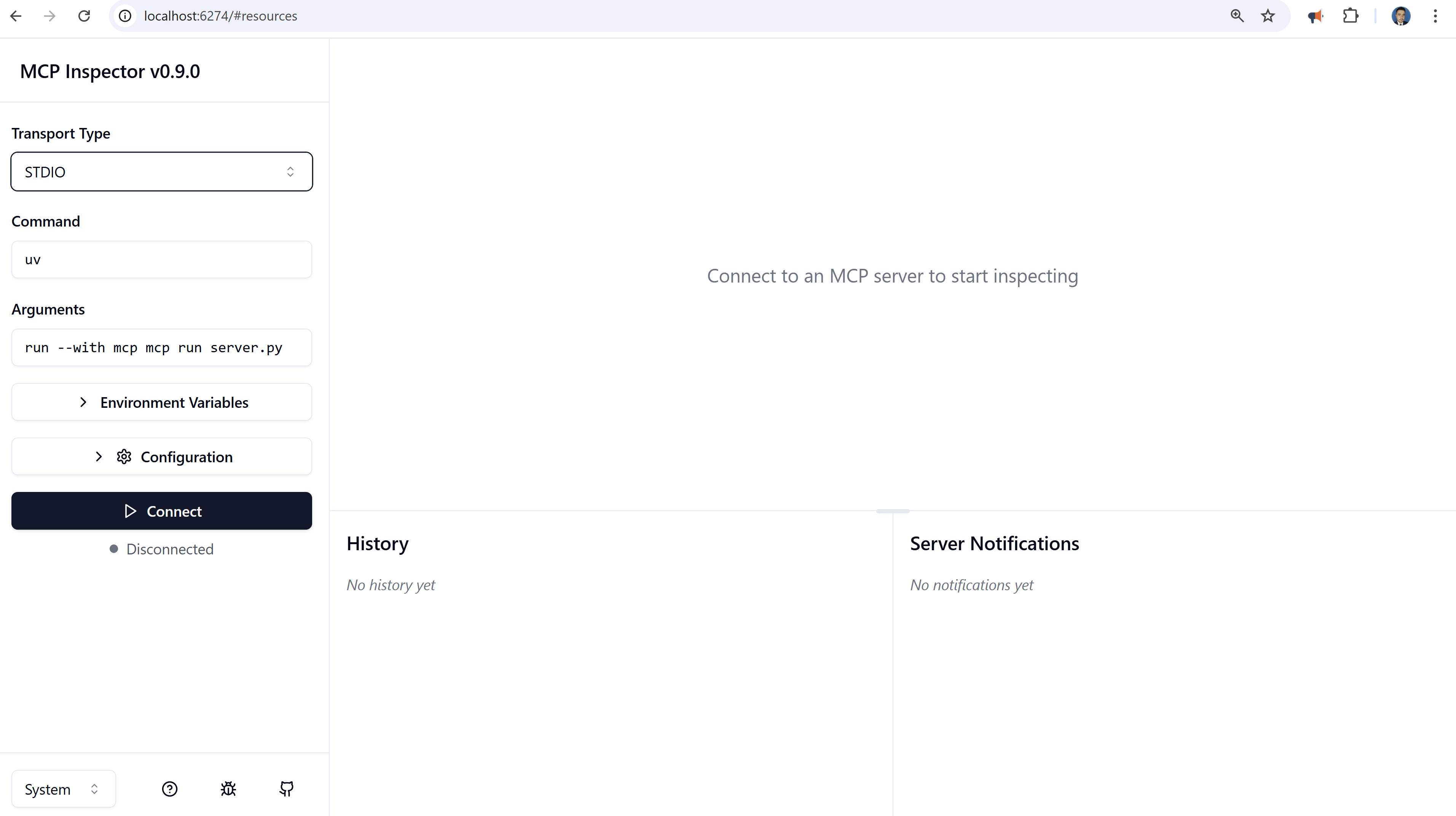 mcp devThe easiest way to interact with your MCP server is using the built-in MCP Inspector, which gives you a visual UI in the browser.