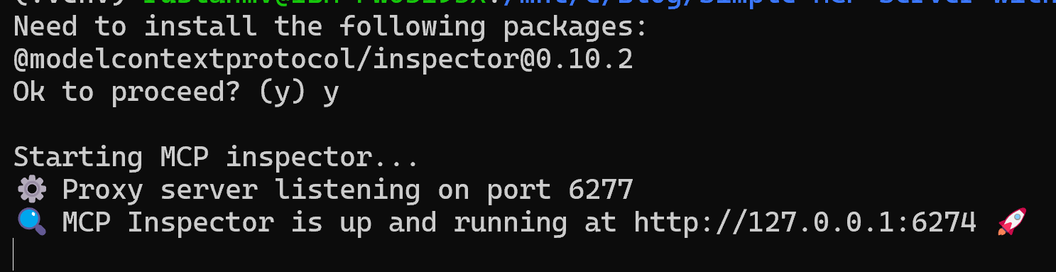http://localhost:6274/, where you can explore and test all the functionalities of your server.After running the command, your terminal output should resemble: