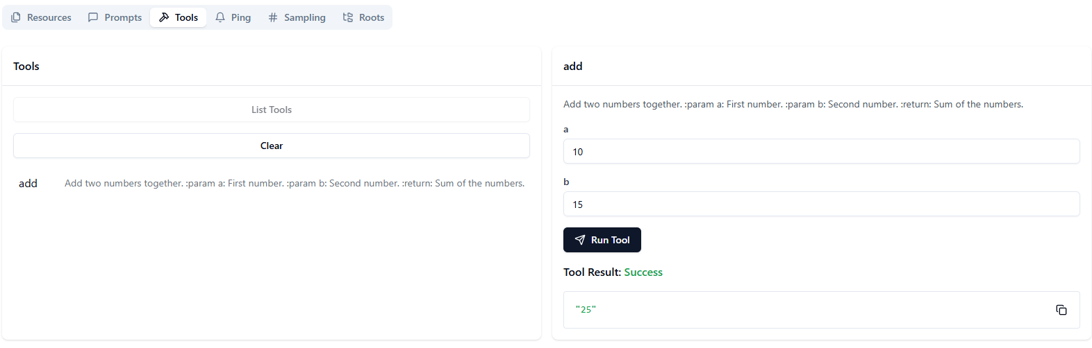 add): Navigate to the add tool in the Inspector.Consider the following scenario while working with our example (which registers an addition tool, a greeting resource, and a code review prompt):